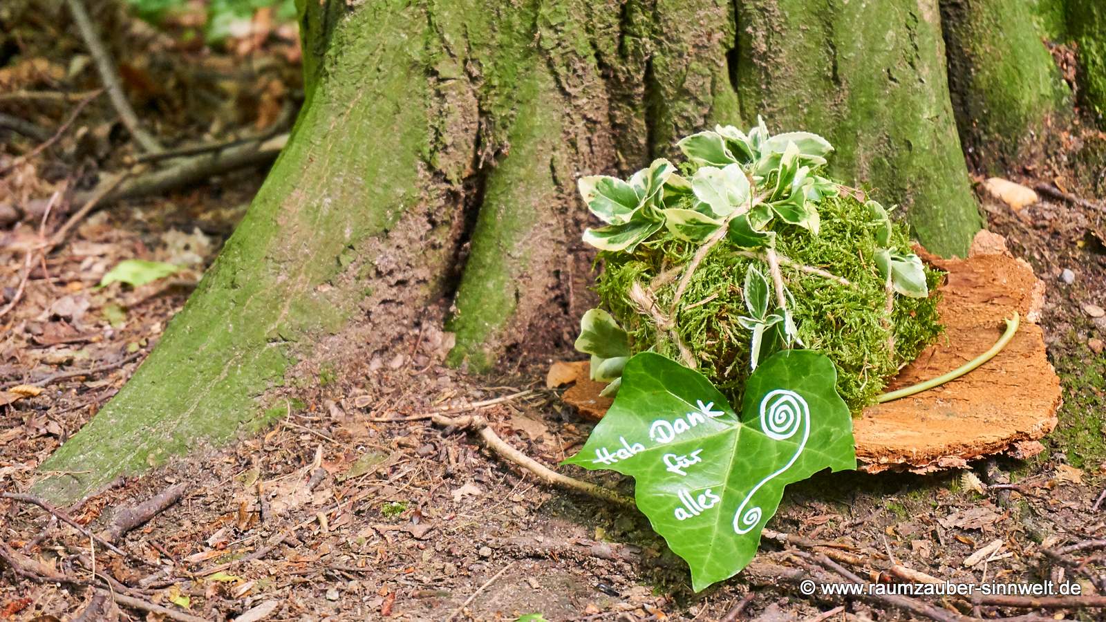 Mooskugel für den Friedwald auf Rinde mit beschriebenem Blatt.