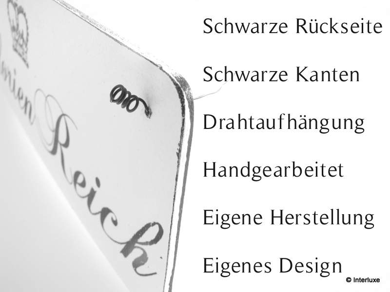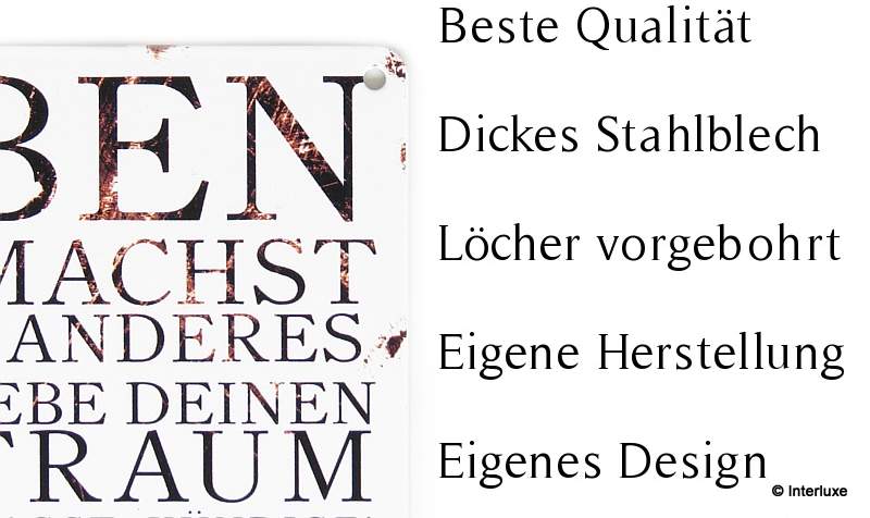 Außergewöhnlich ist die große Auswahl an deutschsprachigen Texten, die man auf importierten Schildern vergeblich sucht. Alle Dekoschilder werden in Deutschland entworfen und von Hand gefertigt. Und damit Sie lange Freude daran haben, werden nur hochwertige Materialien verwendet.