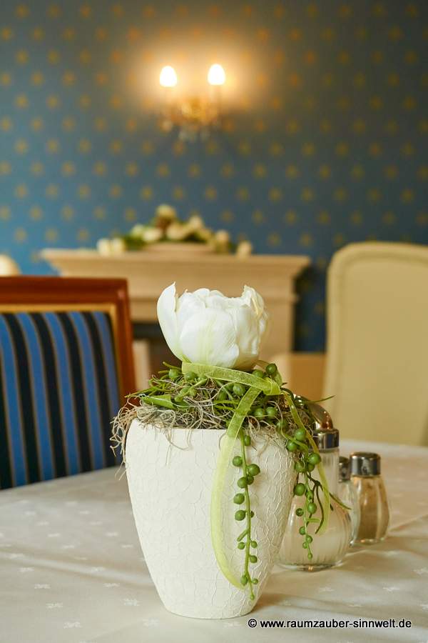 köstliches Ambiente im Restaurant – künstliches Gesteck in stilvoller Keramik
